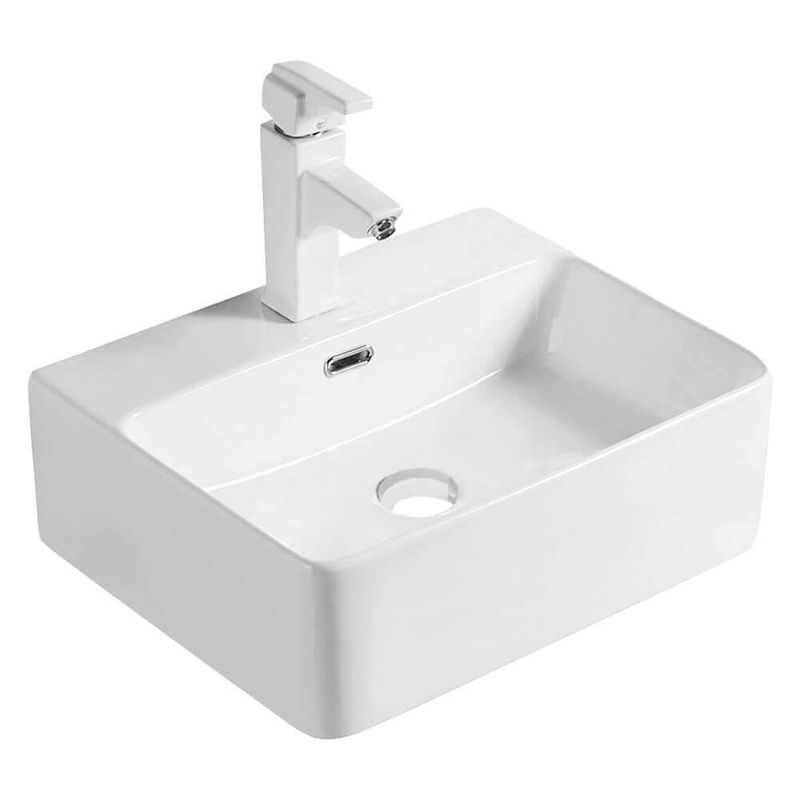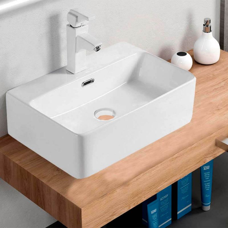 Bacha de Apoyar confeccionada en porcelana sanitaria vitrificada, de color Blanco y diseño Rectangular. Recomendable para griferías Monocomando pico bajo. Con Perforación para griferia. Con orificio anti rebalse. No incluye Sopapa