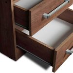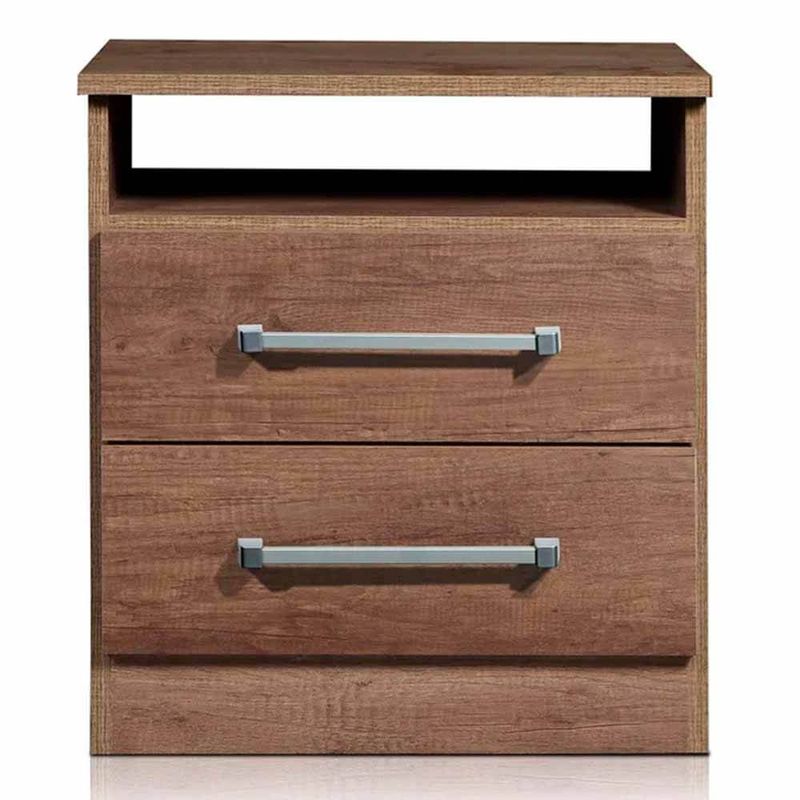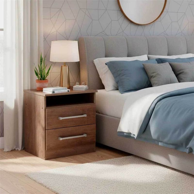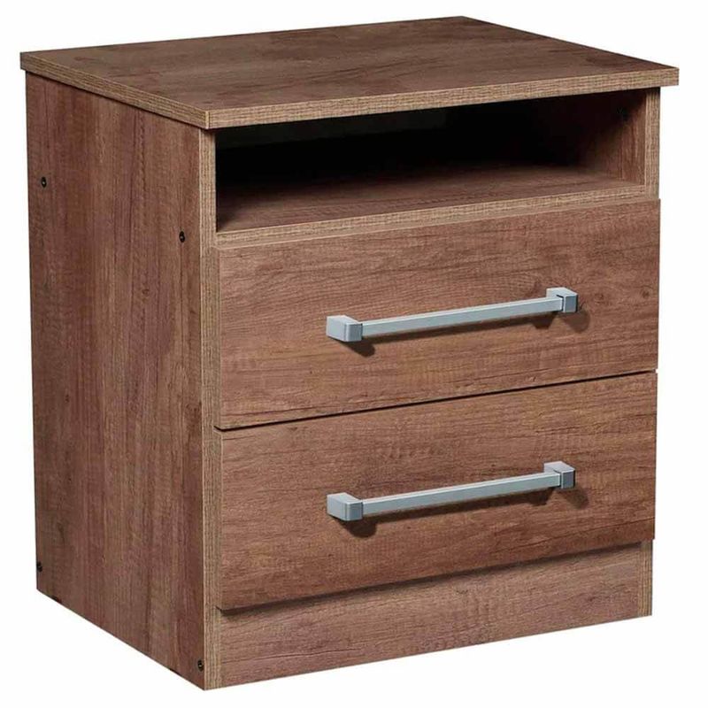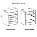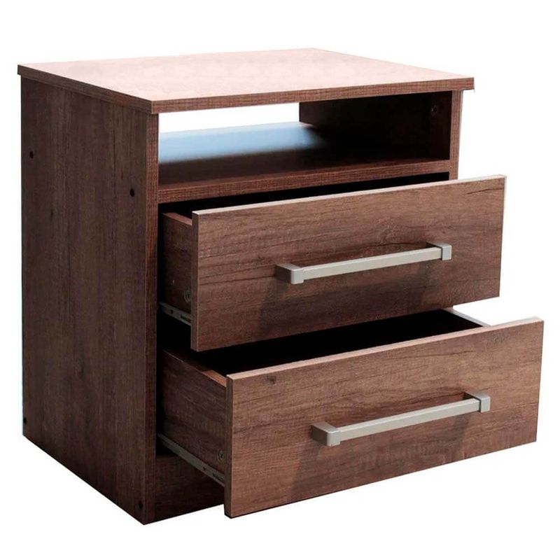 La Mesa de Luz Trio 2C Nebraska Ricchezze es un mueble de dormitorio de estilo convencional, fabricado en melamina texturada color Nebraska, que presenta un acabado rústico y duradero. Sus dimensiones son 48 cm de ancho, 53 cm de alto y 38 cm de profundidad, y su diseño funcional incluye dos cajones que se deslizan sobre correderas metálicas, además de un práctico espacio guardaobjetos (estante abierto) en la parte superior.