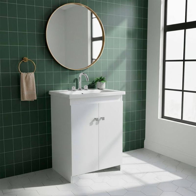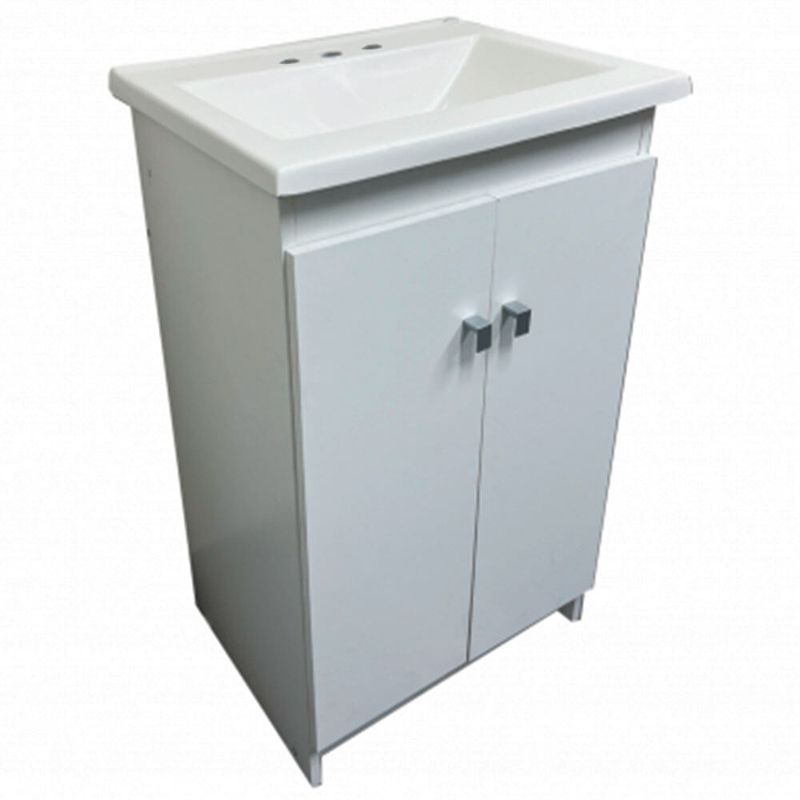Vanitory Blanco con Mesada Superfil de 52x42 Cm, con un diseño que transforma tu baño, confeccionado en melamina (MDF) y Mesada de Marmol Sintetico (MS) de 3 Agujeros, de formato Cuadrada y posee 2 puertas con manijas.